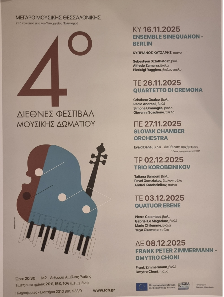 Im November 2025 war Ensemble SineQuaNon Berlin zu Gast beim 4. Internationalen Kammermusikfestival im Megaro Mousikis Thessaloniki, einem der renommiertesten Konzertsäle Griechenlands. Das Festival steht unter der Schirmherrschaft des griechischen Kulturministeriums und versammelte in dieser Ausgabe internationale Ensembles von höchstem Rang, darunter das Quartetto di Cremona, die Slovak Chamber Orchestra und das Trio Korobeinikov.